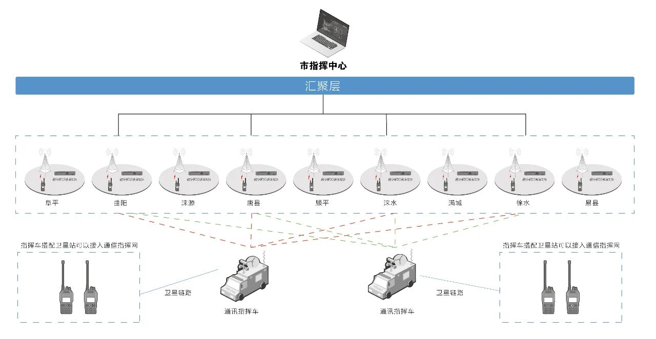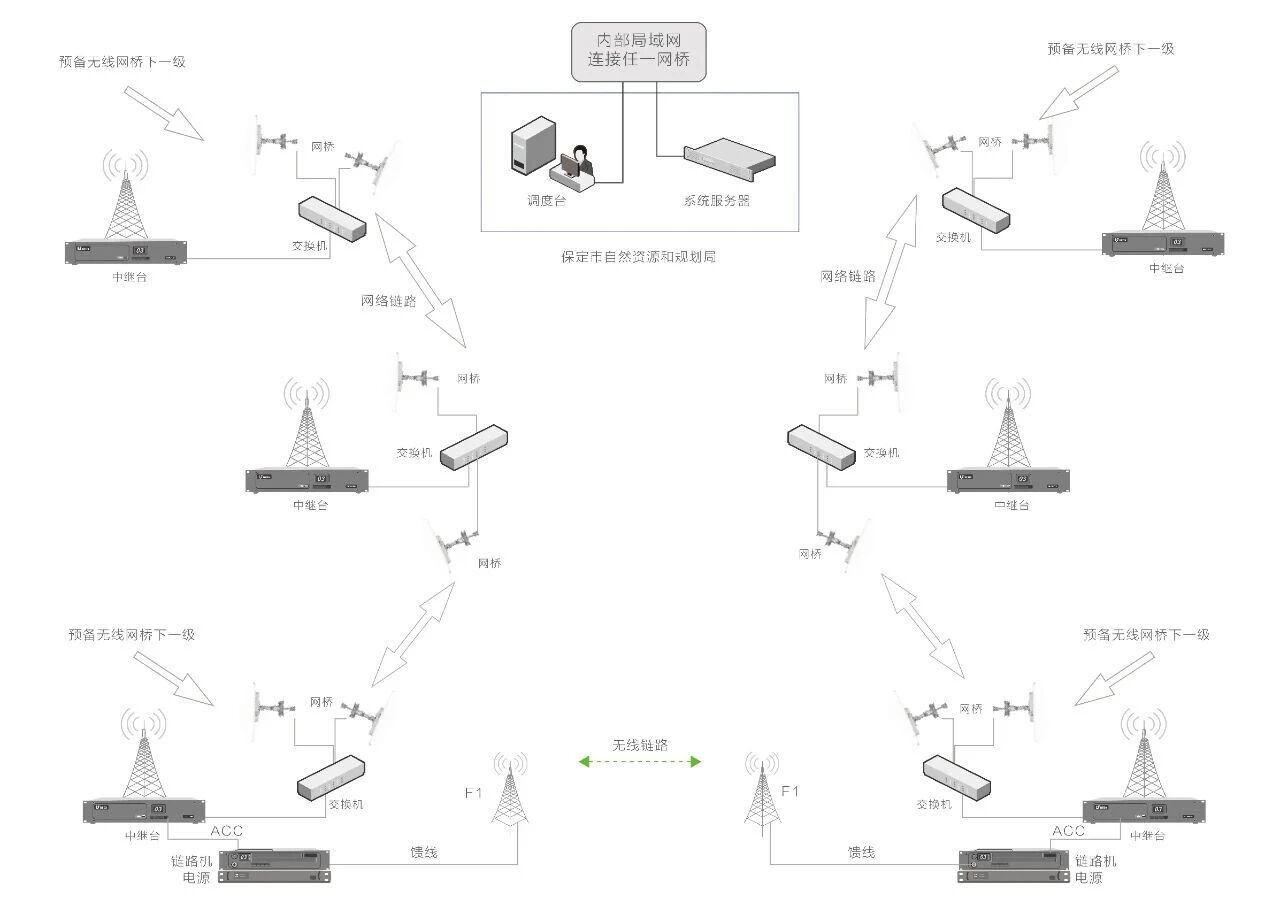 項(xiàng)目涉及9個(gè)縣市(阜平、唐縣、淶源、易縣、淶水、曲陽、順平、滿城、徐水),通信距離遠(yuǎn)、范圍長。通過在固定點(diǎn)架設(shè)BF-TR8500北峰數(shù)字中繼臺和網(wǎng)橋,再利用網(wǎng)橋內(nèi)部網(wǎng)將所有中繼接入調(diào)度系統(tǒng),形成大范圍網(wǎng)絡(luò)覆蓋;當(dāng)部分區(qū)域網(wǎng)橋無法互聯(lián)時(shí),采用 “鏈路機(jī)+中繼站”的模式保障現(xiàn)場通信;后期市指揮中心接入外網(wǎng)即可搭配移動式數(shù)字中繼以及通訊指揮車上的衛(wèi)星站,形成“動中通”、“廣覆蓋”的伴隨式IP中繼站互聯(lián)系統(tǒng),提升不同場景下專網(wǎng)多站組網(wǎng)的部署效率和可靠性。